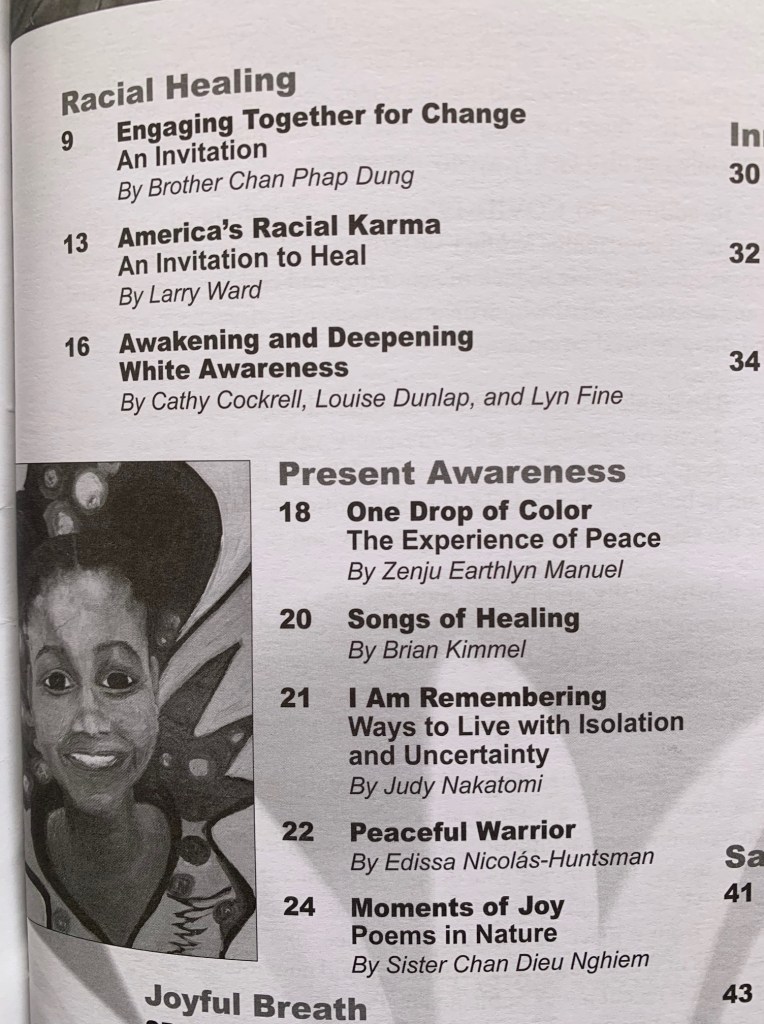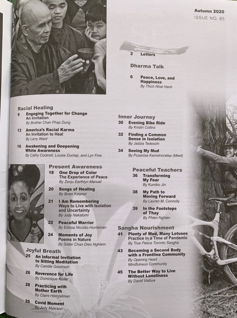Please support the Plum Village Community with a purchase of The Mindfulness Bell Autumn 2020/Issue 85 and read the Venerable Zen Master Thich Nhat Hanh‘s guidance for cultivating “Peace, Love and Happiness” during these challenging days. Plus, you can read my contribution, “Peaceful Warrior,” about how I’ve coped with COVID-19 in my new city.
